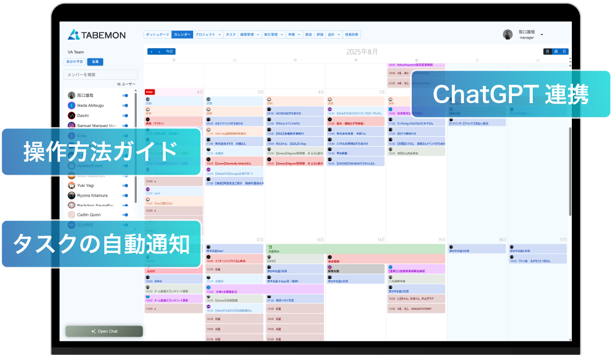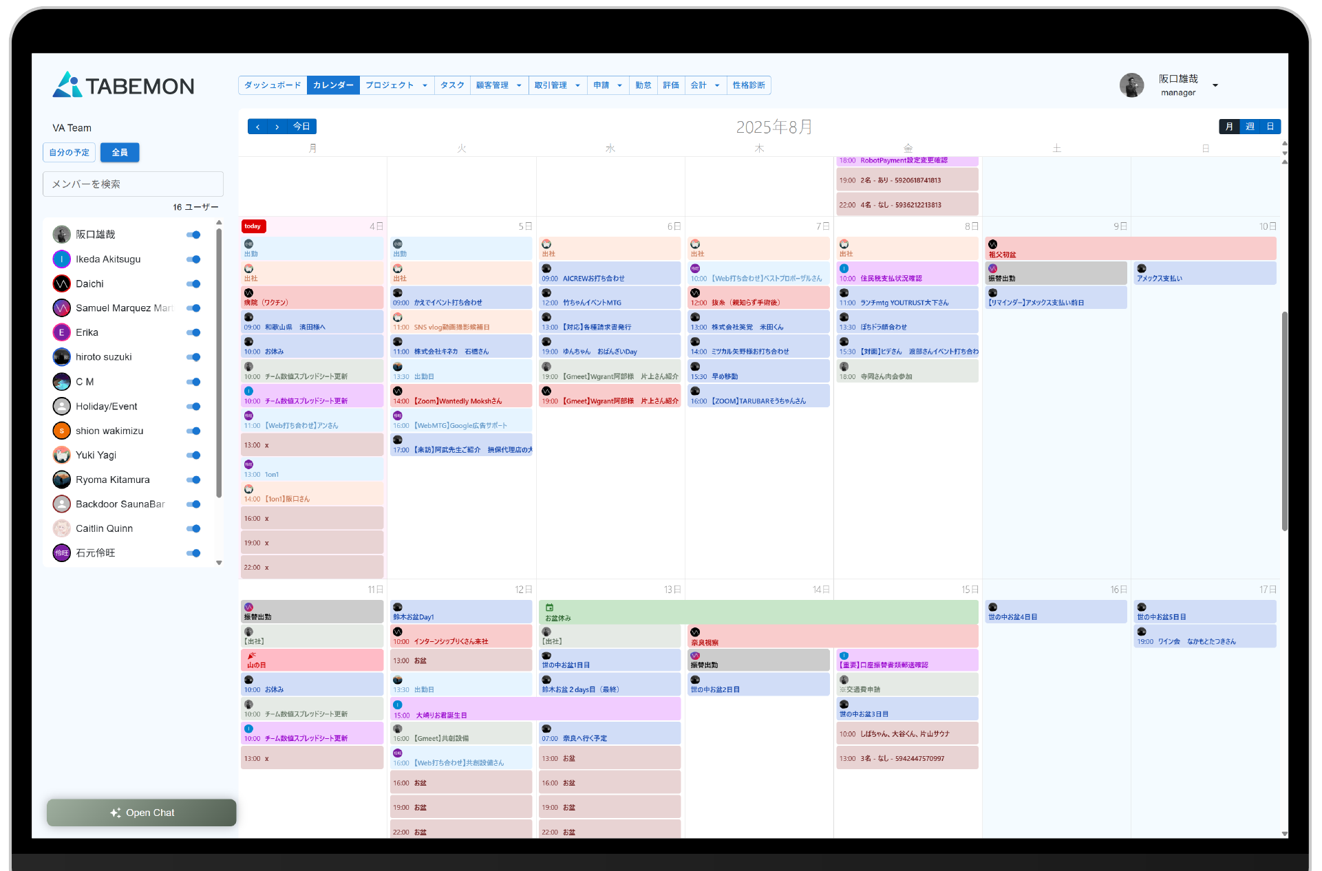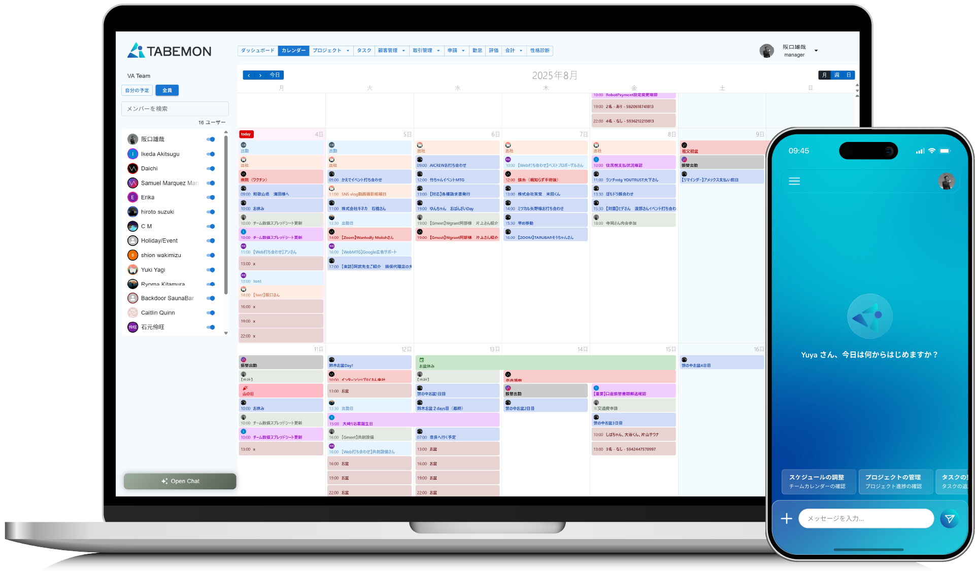 Google calendarと連携できるカレンダー機能です。他のメンバーがどんなスケジュールなのかもTABEMONを使えば簡単に把握できます。